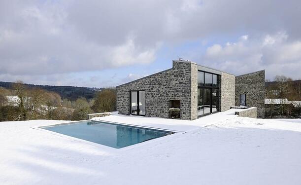 The surrounding environment and the view from the top of the field led us to use materials that integrate in this context. The facades are entirely made of stone, and the building is partially buried, in order to integrate a maximum in the site. The large windows allow to keep transparency, constantly offering occupants views of the garden and lightening the volume. Despite the use of stone in front, massing, roof, openings, make it an open, contemporary building.
