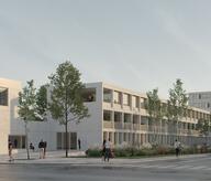 UN BALCON SUR LE PAYSAGE DES COLLINES Perçu depuis le site actuel de l’école, le paysage paraît fermé par la topographie et fragmenté par les infrastructures. Mais vu d’en haut, le paysage redevient ouvert et lisible. Le regard s’étend jusqu’à l’horizon des collines voisines. On devine Grâce-Hollogne et Seraing de l’autre côté de l’autoroute, et puis la Meuse en contrebas. On voit la course du soleil. Le premier principe est donc de concevoir l’école comme un long balcon tourné vers le paysage. En contrepartie, un volume contenant les fonctions bruyantes (sport, fête, réfectoire) est implanté parallèlement à l’autoroute pour protéger les espaces de classe et de récréation contre le bruit de cette dernière et des vents importants sur la ligne de crête. UN VERGER AU COEUR DU QUARTIER Le quartier du Boutte ressemble à une grande casbah en hauteur, encerclée par une muraille d’infrastructures, et irriguée par un dédale de rues et de venelles. Mais il lui manque un centre : un lieu où se rassembler et faire communauté, mais aussi un lieu pour rayonner au-delà de ses murs et accueillir les habitants des autres quartiers. Pour ce faire, le site est d’abord aménagé comme un grand verger, inspiré de ceux typiques de la région liégeoise. Il s’étend depuis le Thier de Jace jusqu’au coteau qui descend vers les fonds de jardins voisins.