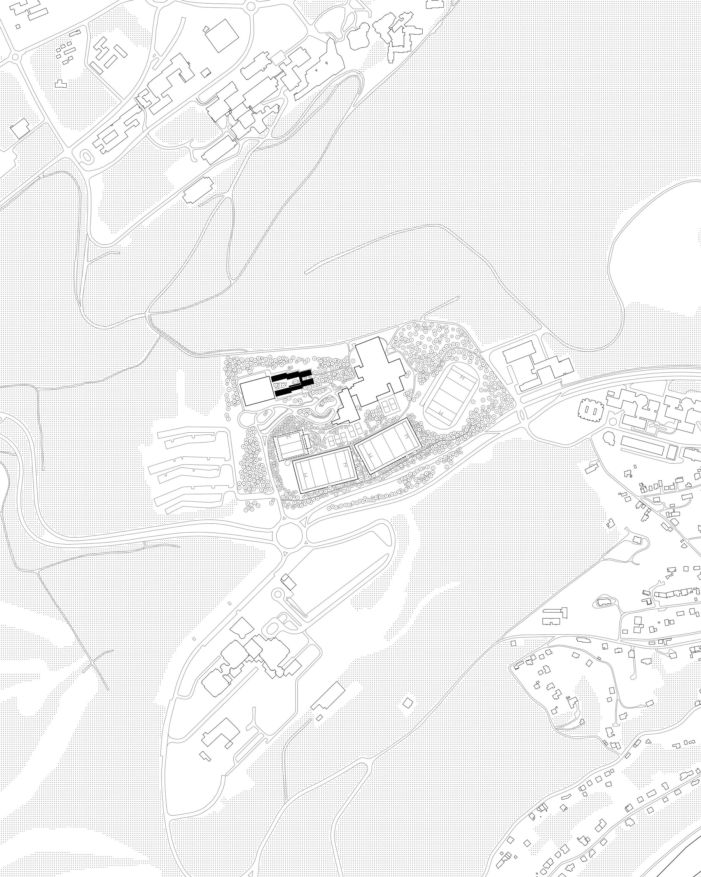 Le bâtiment est caractérisé par une implantation symétrique de deux longues ailes distinctes, chaque aile étant composée de trois éléments implantés « en escalier » dévoilant ainsi trois cours de dimensions variables intériorisées au projet. La plus grande cour est partiellement refermée par la présence d’une grande halle de sport complétant l’ensemble de la composition.