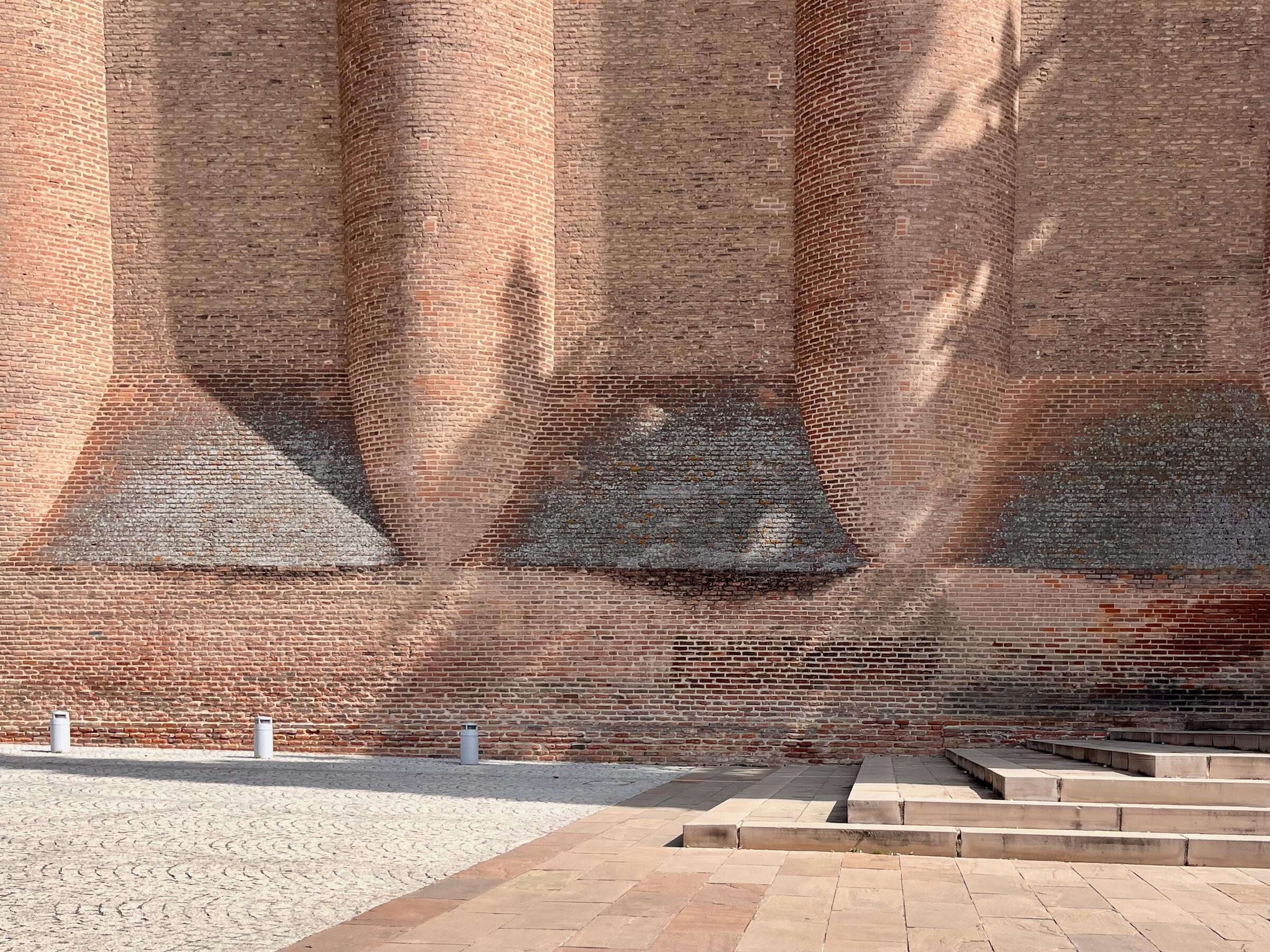 Les ruelles et la place du Château réaménagés dans le cadre du projet constituent un nœud d’articulations en plan comme en coupe, où les aménagements s’ajustent aux espaces et aux bâtiments adjacents par une succession de gradins, de pentes et d’excroissances. La matérialité puise dans le vocabulaire albigeois, mêlant calades et briques foraines dans leurs teintes et formats traditionnels, afin d’inscrire le projet dans la continuité constructive du site. La place du Château s’organise dans la géométrie propre du lieu, accueillant à la fois un plan d’eau et un espace libre destiné aux usages festifs. Au pied du viaduc, un long banc fontaine monumental se dresse, retournant la vue « sous l’eau » et vers la cathédrale. À la fois fontaine et mobilier convivial, il ancre la place dans une dimension urbaine et paysagère, entre monumentalité et appropriation quotidienne.