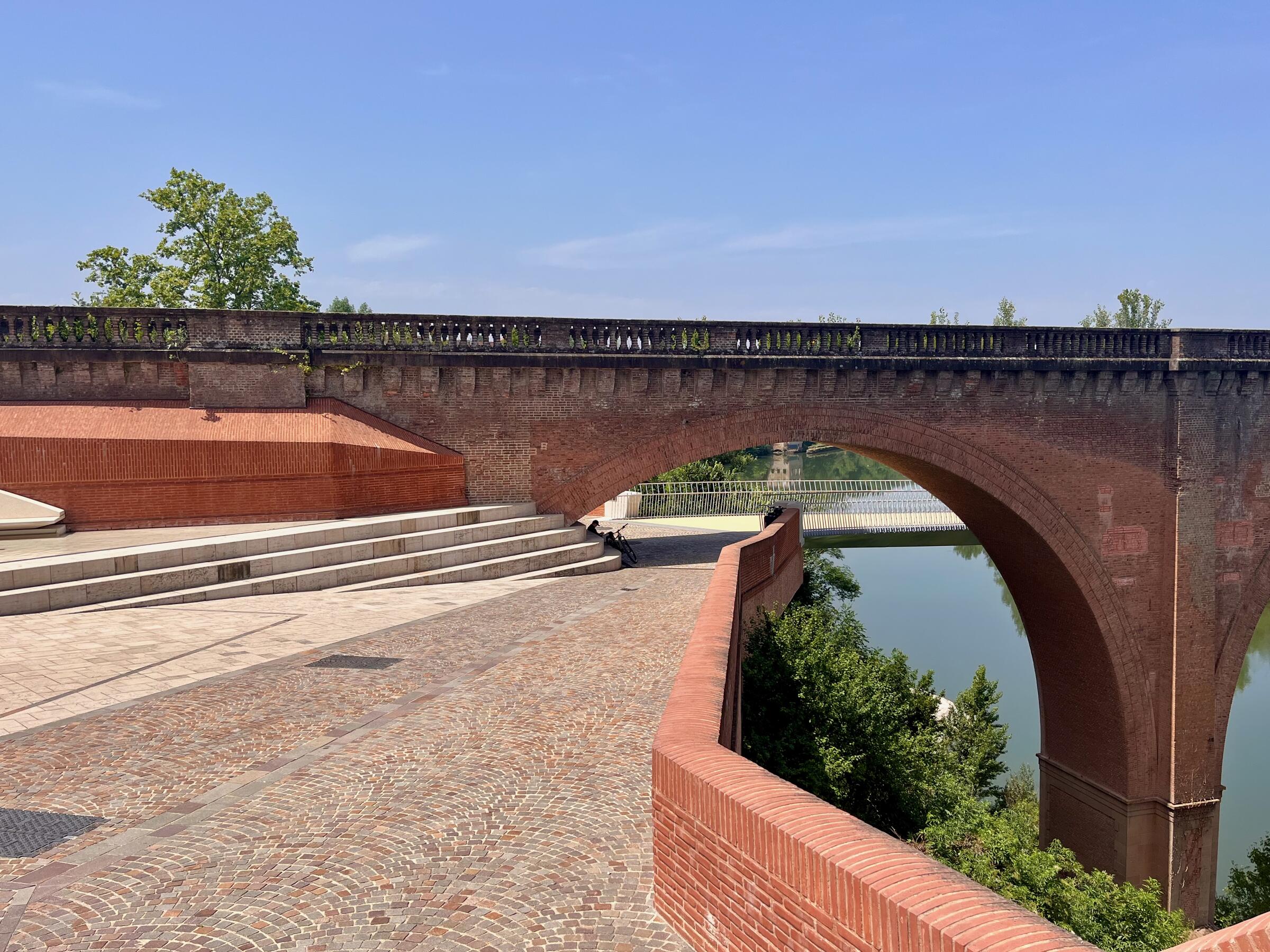 Classé au patrimoine mondial de l’UNESCO, le centre-ville d’Albi se distingue par une matérialité singulière et une composition urbaine à la fois organique et géométrique. La « Ville rouge », façonnée par la brique foraine, s’organise autour de la boucle du Tarn qui scinde son territoire en deux. En rive gauche, le centre historique déploie une scénographie urbaine puissante, dominée par la Cathédrale fortifiée Sainte-Cécile et le Palais épiscopal, imposant tous deux leur monumentalité de briques. Cette mise en scène est renforcée par la présence de trois ponts à multiples travées, qui assurent les liaisons et renforcent le rayonnement du site. Le plus à l’ouest, un viaduc ferroviaire du XIXᵉ siècle franchit le Tarn en treize arches élégantes, mais impose sa masse brutalement sur le plateau rocheux, interrompant la continuité entre le centre historique, son promontoire et le quartier du Castelviel.