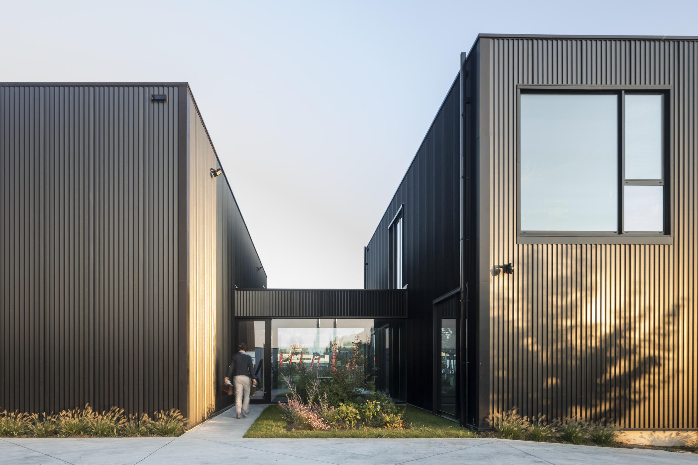 Ces deux volumes sont reliés l’un à l’autre par un troisième volume, un sas d’entrée vitré permettant de situer aisément l’entrée du bâtiment. Le fait que ce volume soit vitré permet également de créer des relations visuelles entre la zone de circulation et la zone de plantations ; ainsi, lorsque l’on arrive dans le bâtiment, le regard se porte sur un cadre vert agréable.